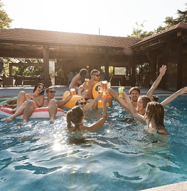 Experience a stunning swimming pool with 100+ stylish pool-deck seating for unforgettable celebrations and relaxing moments.